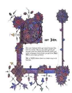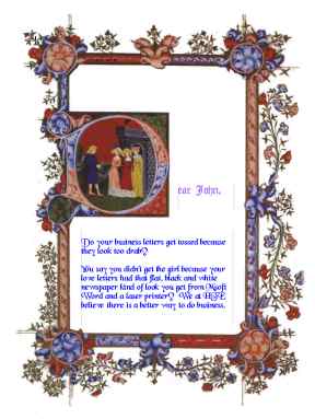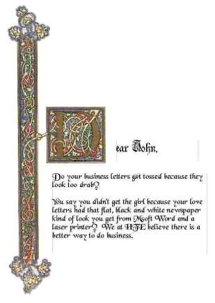 Now, suppose everything you've seen so far, while adequate for many purposes, simply is not good enough for that person you'd like to really impress. In that case, you will need to download the Bearfabrik illuminated page set. That set contains three illuminated pages in Word format which can easily be modified to your needs: